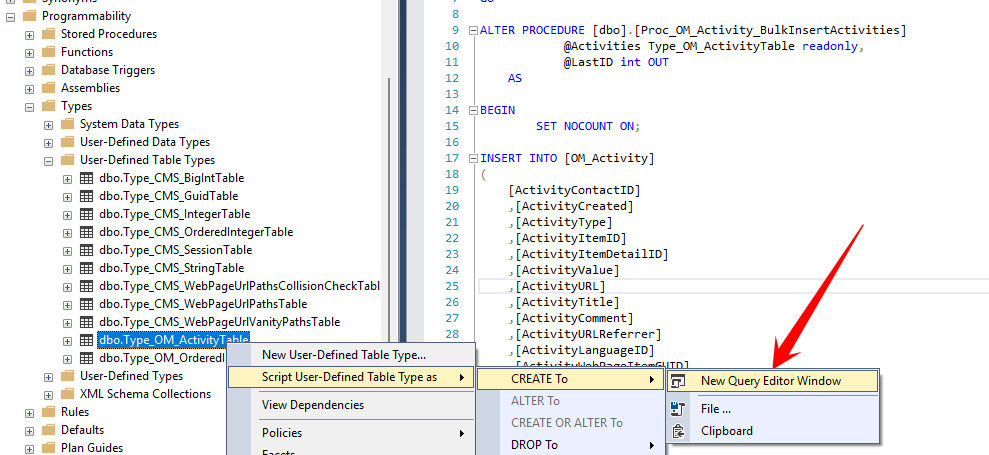 - Update the stored procedure Proc_OM_Activity_BulkInsertActivities with the new user-defined table type name in #2 so can delete the corrupt one.